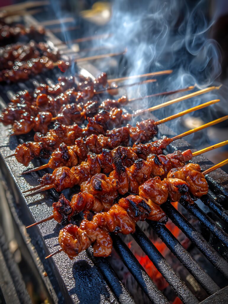 A close up image showcasing sizzling chicken satay skewers on a barbecue grill. The skewers are glazed with a delicious, rich sauce, and smoke rises from the hot coals. This image evokes feelings of warmth and deliciousness. Hello world!